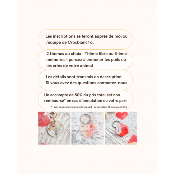L'atelier est a payer entièrement. Attention sur les 15€, 50% de la somme est considérée comme acompte et est non remboursable en cas d'annulation de votre part. La somme de 7€50 vous sera seulement remboursée si vous annulez. Le reste compte pour la préparation de votre collier et l'achat de la matière première engendrée exprès.