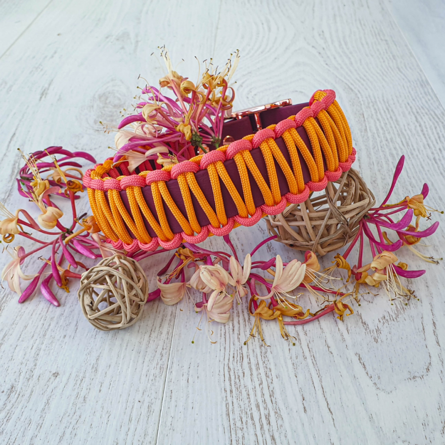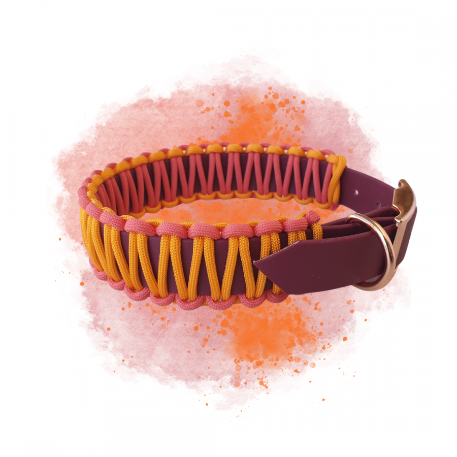 Le collier NALA est composé d'une sangle en Beta BioThane® wine et d'une paracorde de couleur orange.