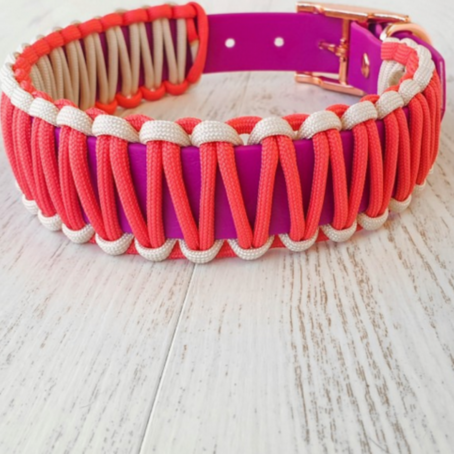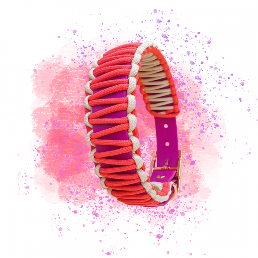 Le collier NALA est composé d'une sangle enduite fuschia et d'une paracorde rose et crème.
