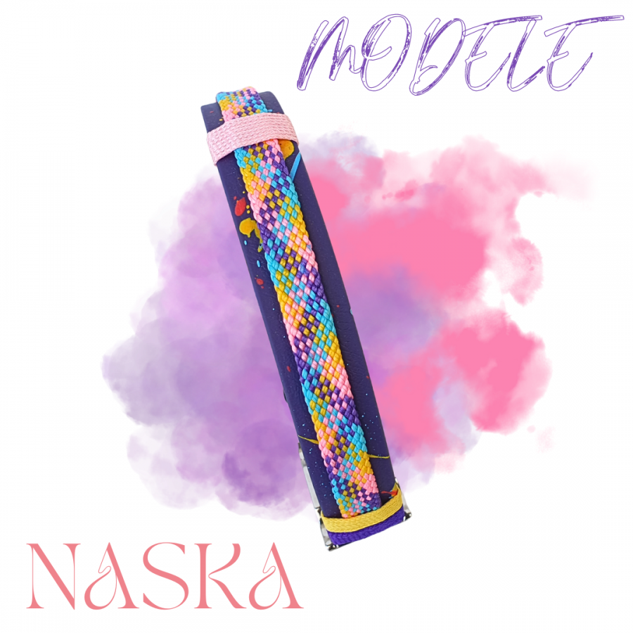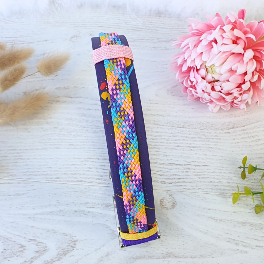 Le collier NASKA est composé d'une sangle Beta BioThane ®noire et d'une paracorde PPM violet jaune rose bleu