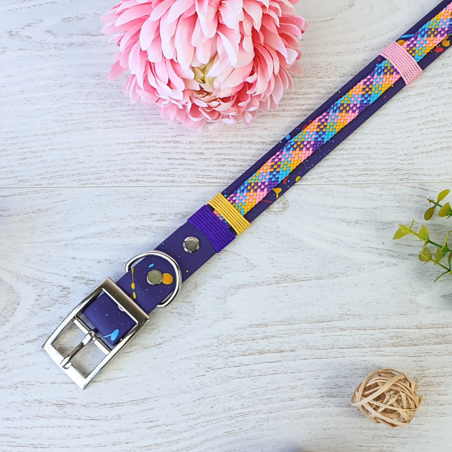 Le modèle NASKA est un collier réglable en Beta BioThane ® avec une paracorde de couleur au centre. Le collier a était peint sous le dessous avec des éclaboussures de peinture.