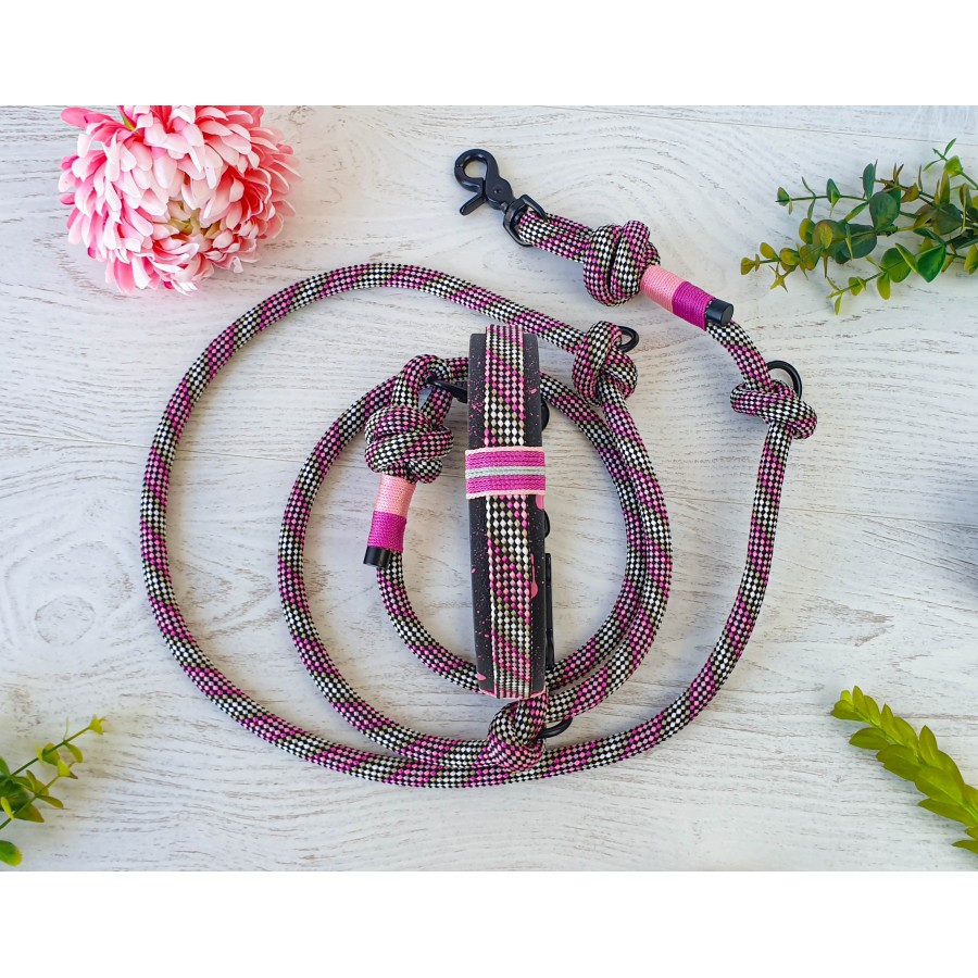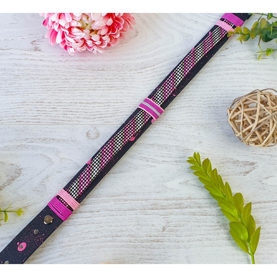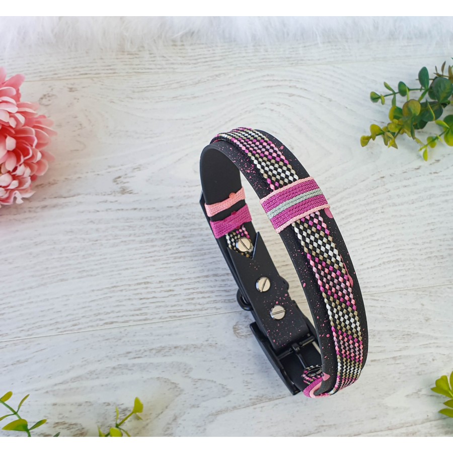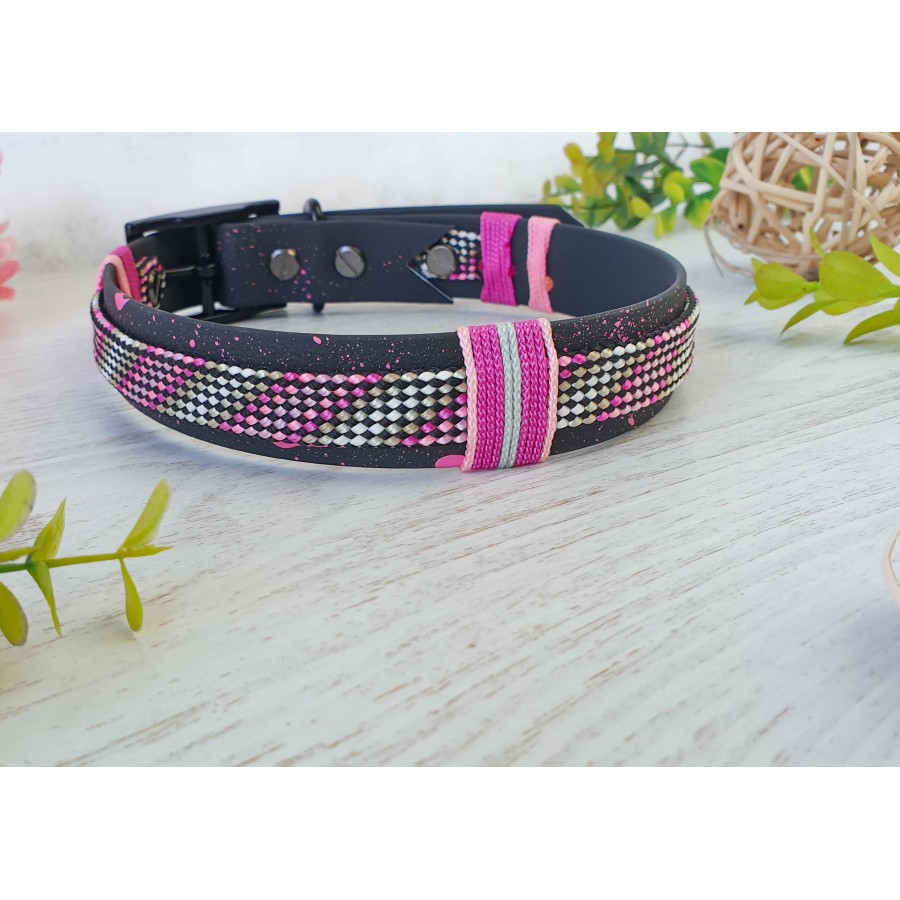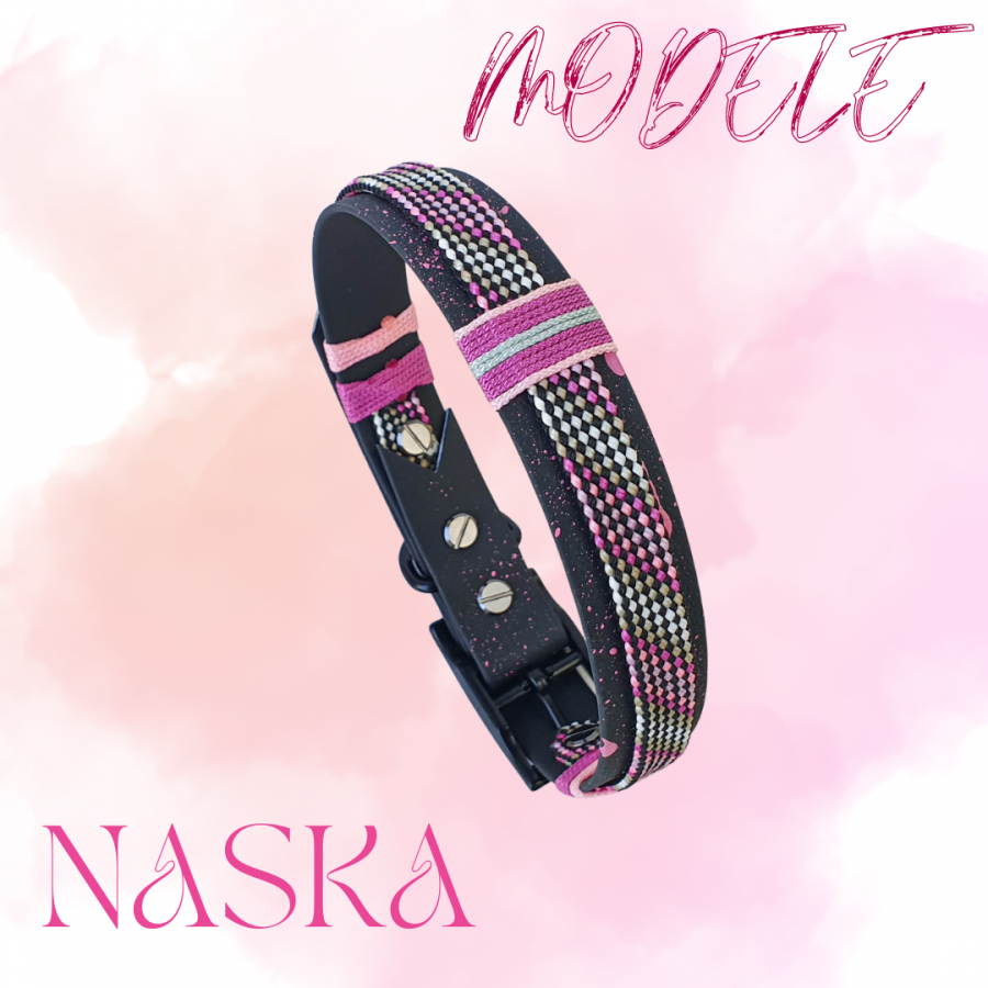 Le collier NASKA est composé d'une sangle Beta BioThane ®noire et d'une paracorde PPM rose noir et beige