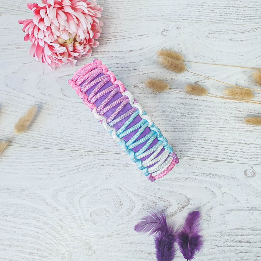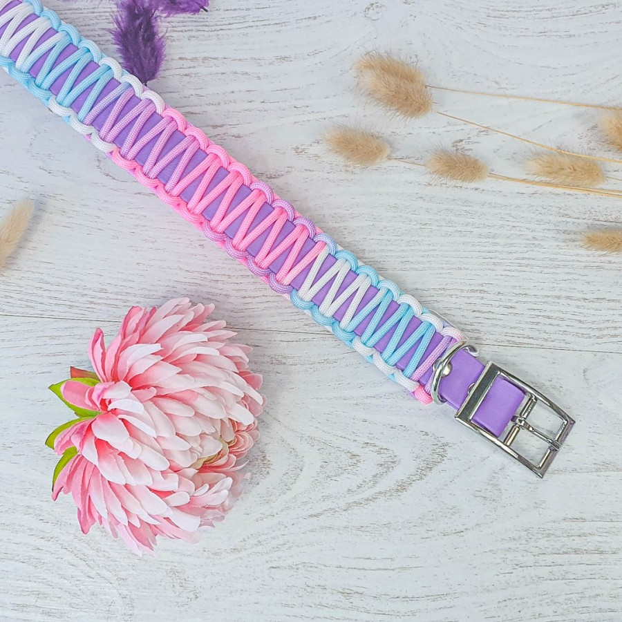 Le collier NALA de chez Be'tween-us est un collier composé d'une sangle en Beta BioThane® violette amethyste et d'une paracorde aux couleurs variables ( bleu violet rose) au fil du tressage.