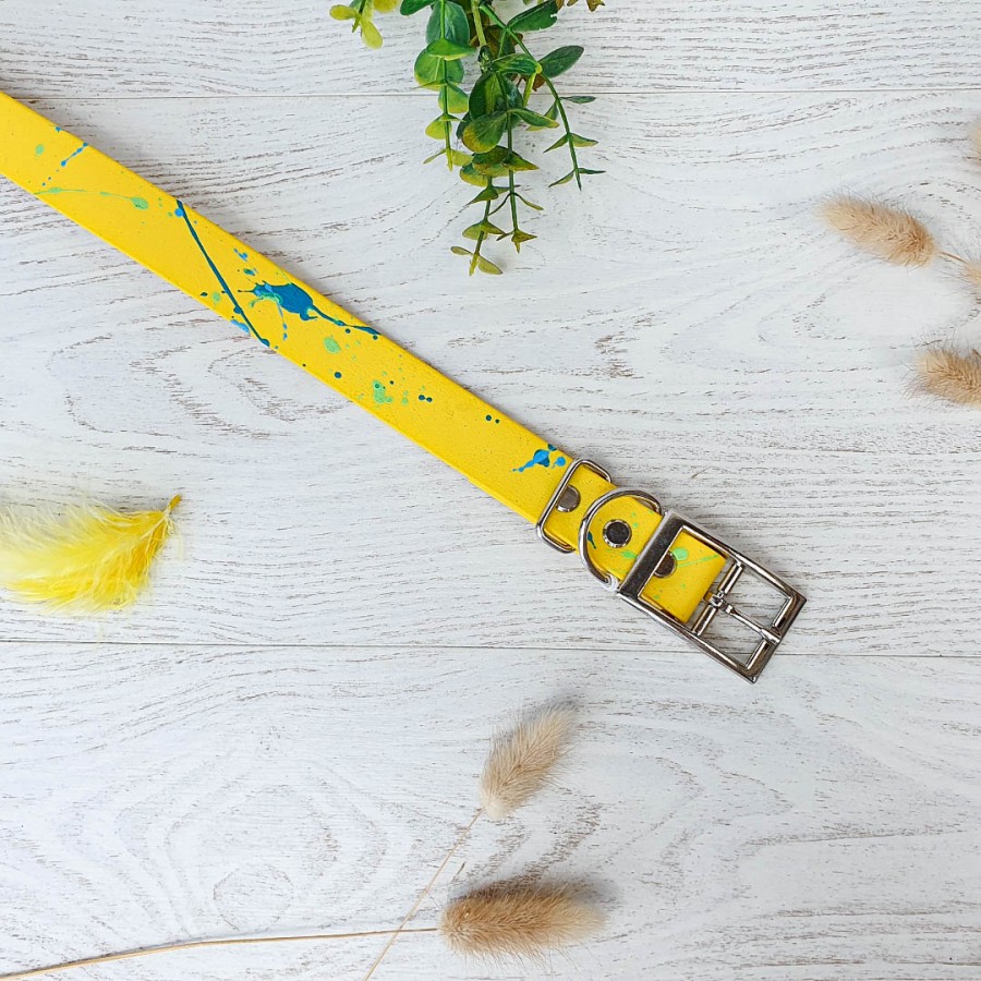 Le modèle ASTON est un collier en biothane auquel des éclaboussures de peinture ont été rajouté pour donner une touche unique à cette création. Il est parfaitement adapté aux chiens de moyenne et grande taille qu’il soit à poil court ou long.