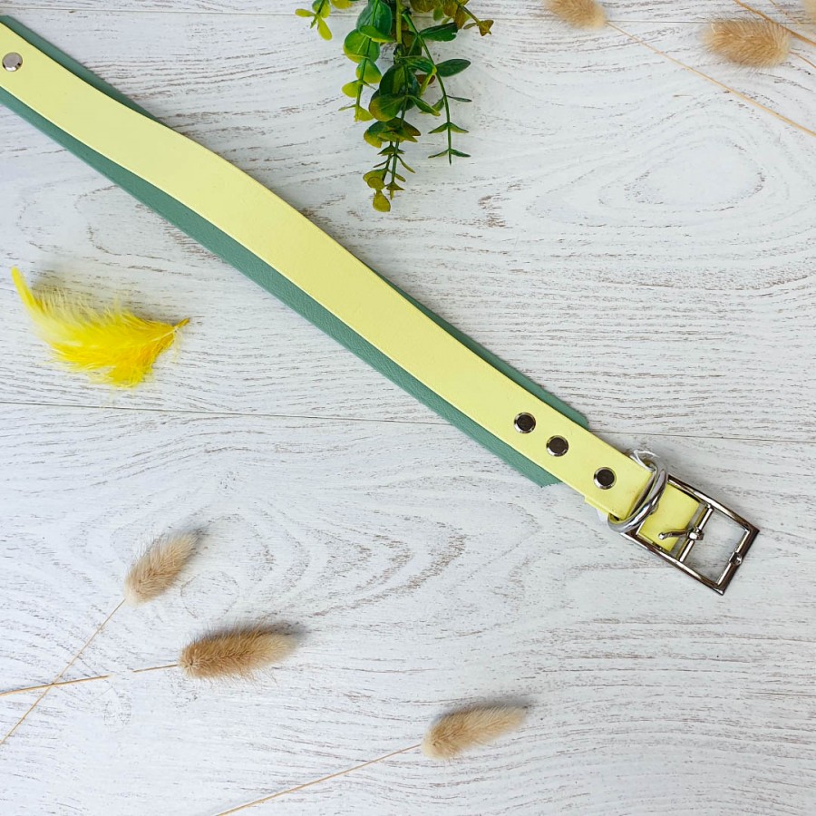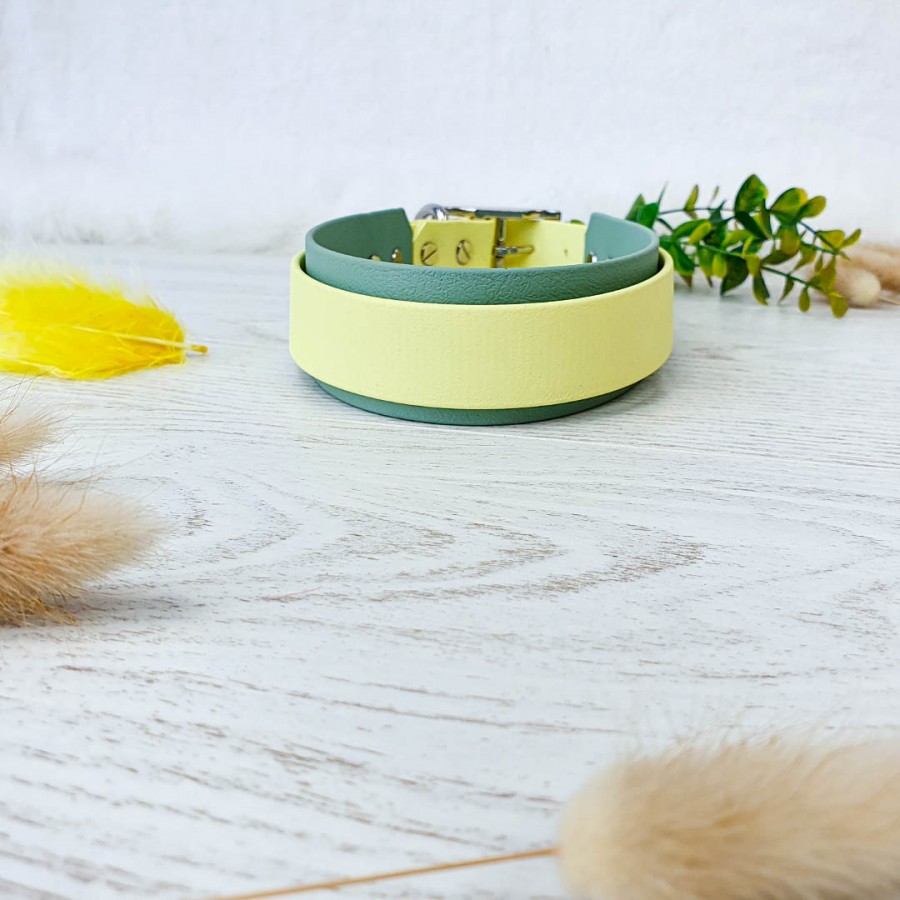Le modèle GEMMA est un collier composé de deux biothanes de largeurs différentes. Un biothane en 38mm ajouté à une base en 25mm.