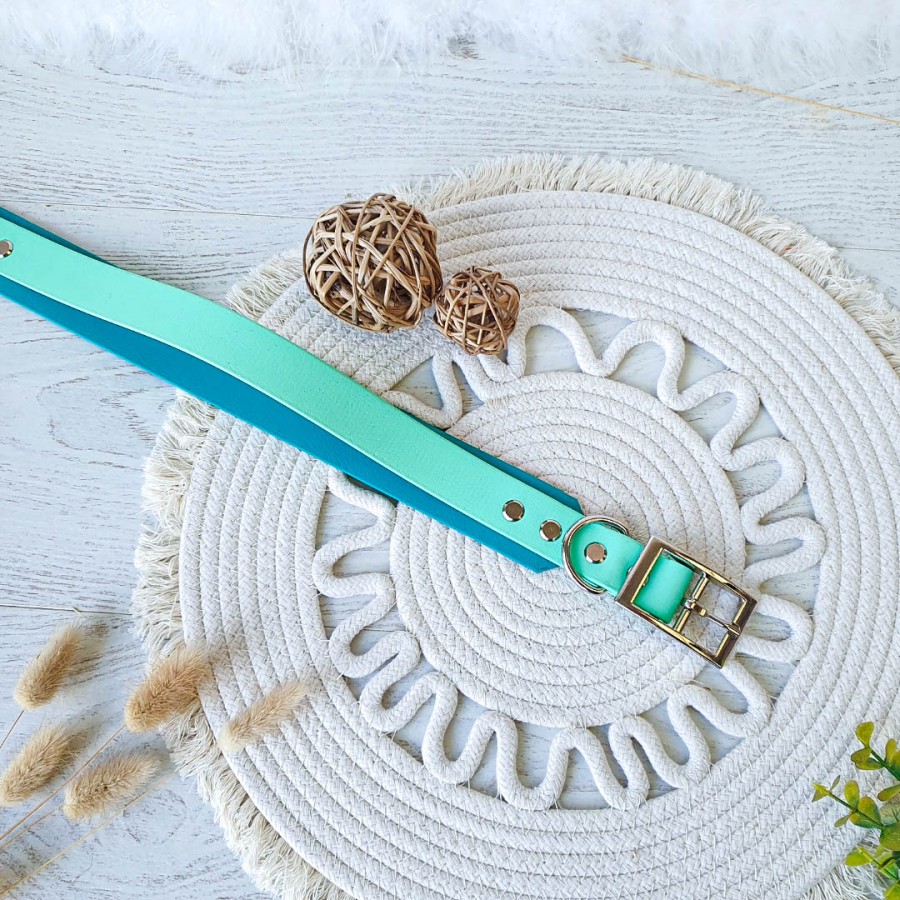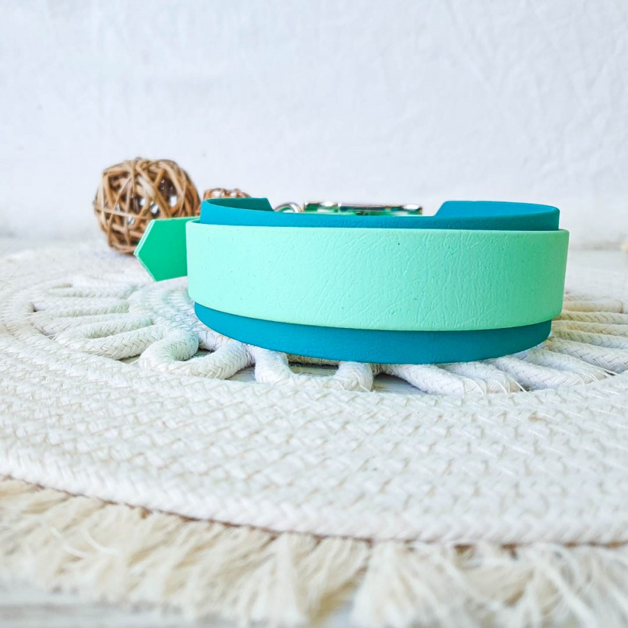 Le modèle GEMMA est un collier composé de deux biothanes de largeurs différentes. Un biothane en 38mm ajouté à une base en 25mm.