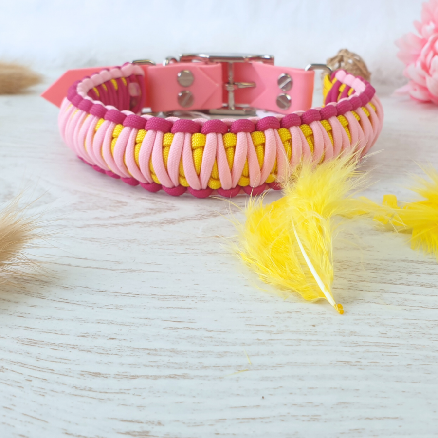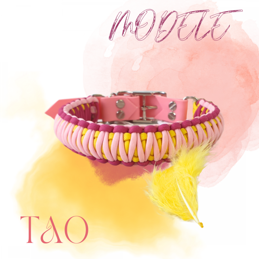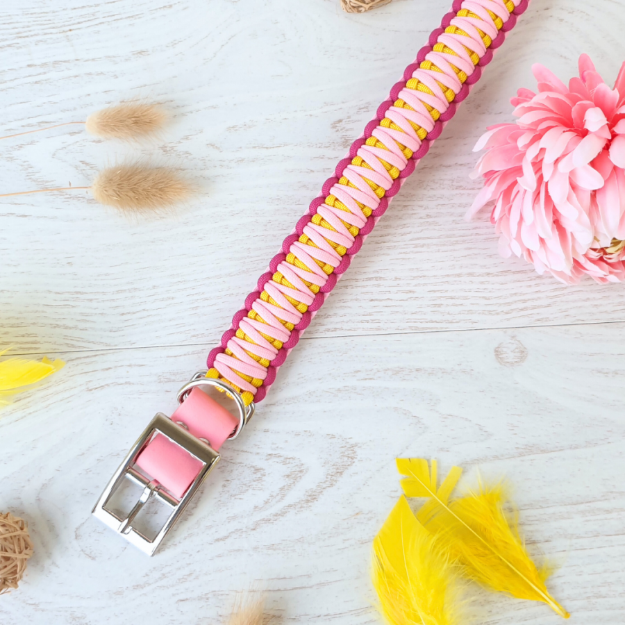 Collier TAO Rose pâle, fuschia et jaune avec bouclerie argentée et Biothane rose réglable sur 6 cm.. Il est parfaitement adapté aux chiens de toute taille qu’il soit à poil court ou long.