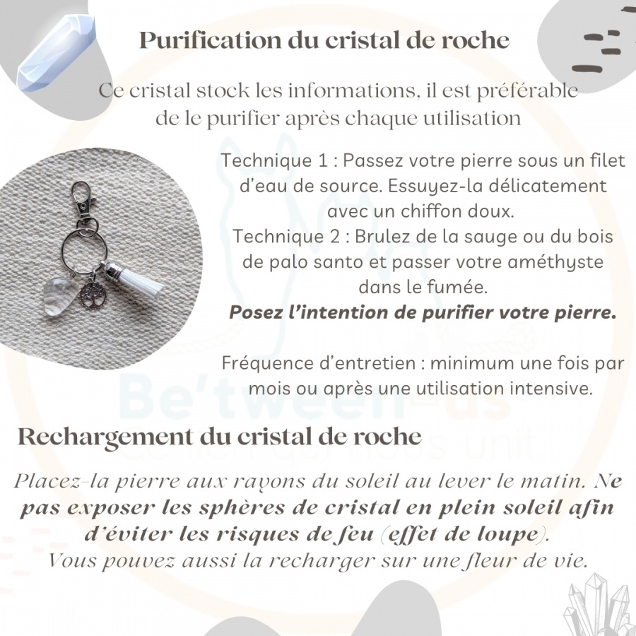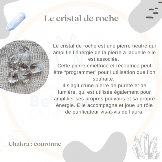 Le cristal de roche est une pierre neutre qui amplifie l’énergie de la pierre à laquelle elle est associée.