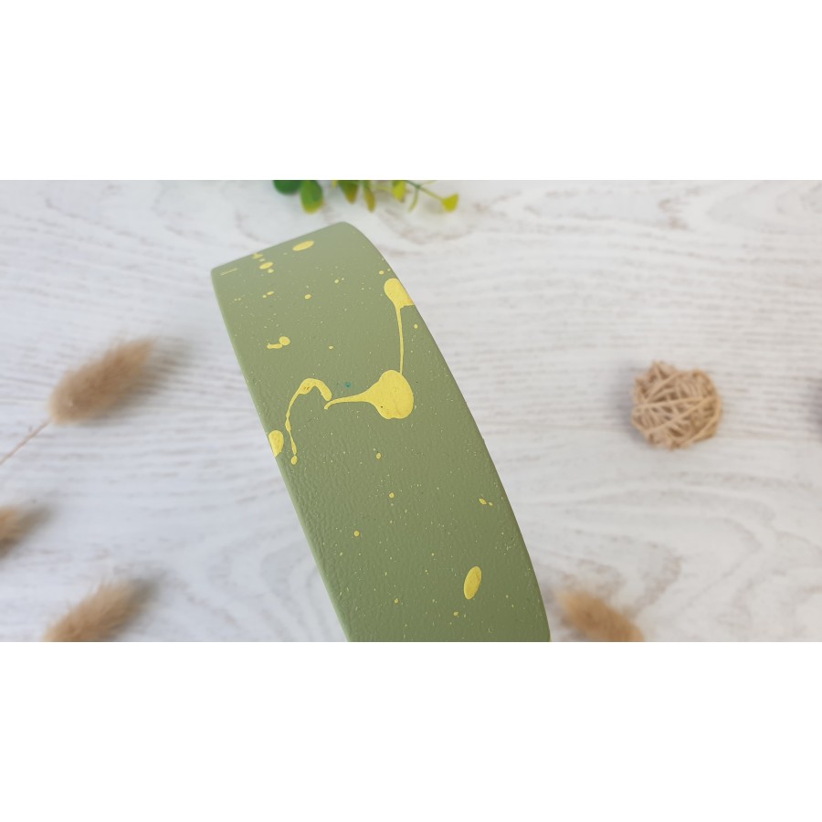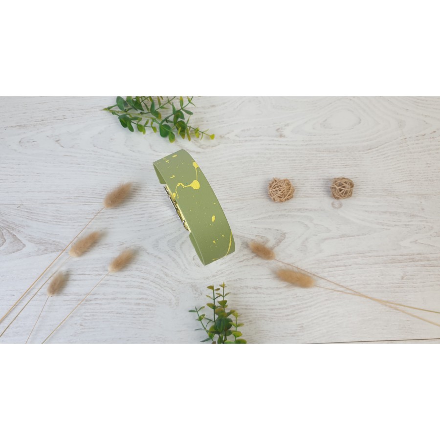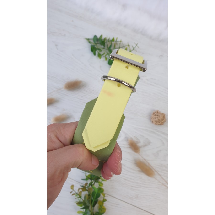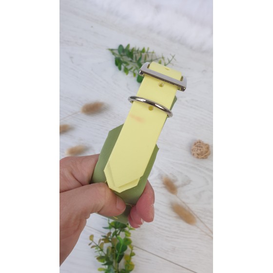 Une tâche rouge est visible sur l'attache biothane jaune et un point bleu sur le milieu du collier.