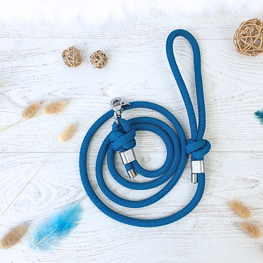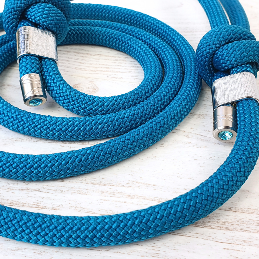 Un noeud et un passant métal bloquent la corde. Un embout en métal avec un strass de swarovski bleu donne un effet chic à cette laisse. Elle est équipée d’un mousqueton mexicain pour attacher au harnais ou au collier de votre compagnon.