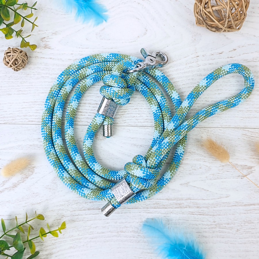 Un noeud et un passant métal bloquent la corde. Un embout en métal avec un strass de swarovski bleu donne un effet chic à cette laisse. Elle est équipée d’un mousqueton mexicain pour attacher au harnais ou au collier de votre compagnon.