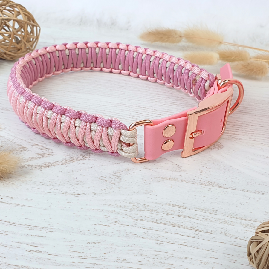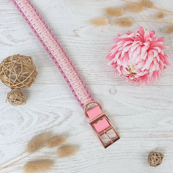 Collier TAO rose et crème avec bouclerie argentée et Biothane pastel rose réglable sur 6 cm.. Il est parfaitement adapté aux chiens de toute taille qu’il soit à poil court ou long.